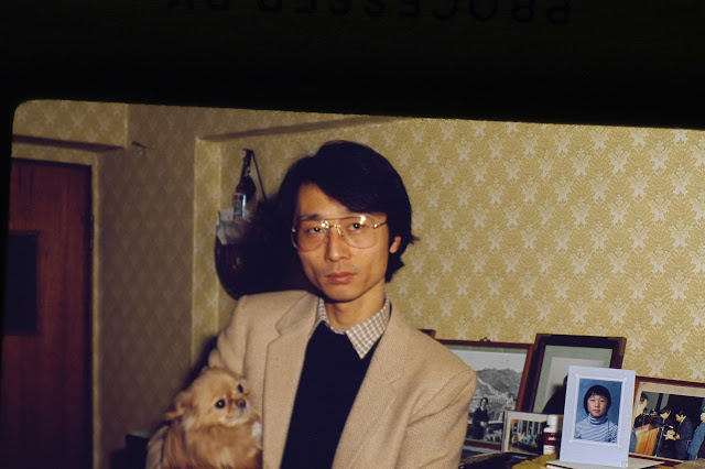 | There's something amazing about this photo from a slide of my father in Korea with a cute little dog and on the bureau is one of my class photos circa 1979. |